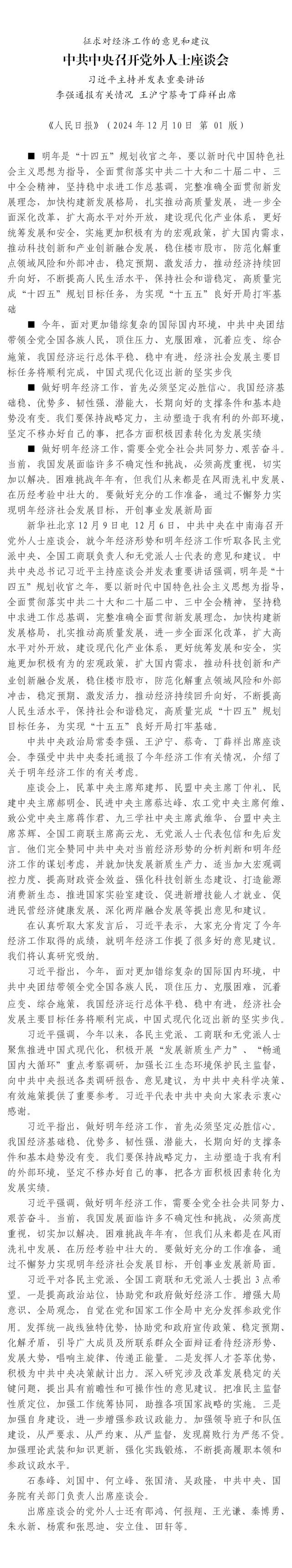 征求對經(jīng)濟工作的意見和建議 中共中央召開黨外人士座談會 習(xí)近平主持并發(fā)表重要講話 李強通報有關(guān)情況 王滬寧蔡奇丁薛祥出席