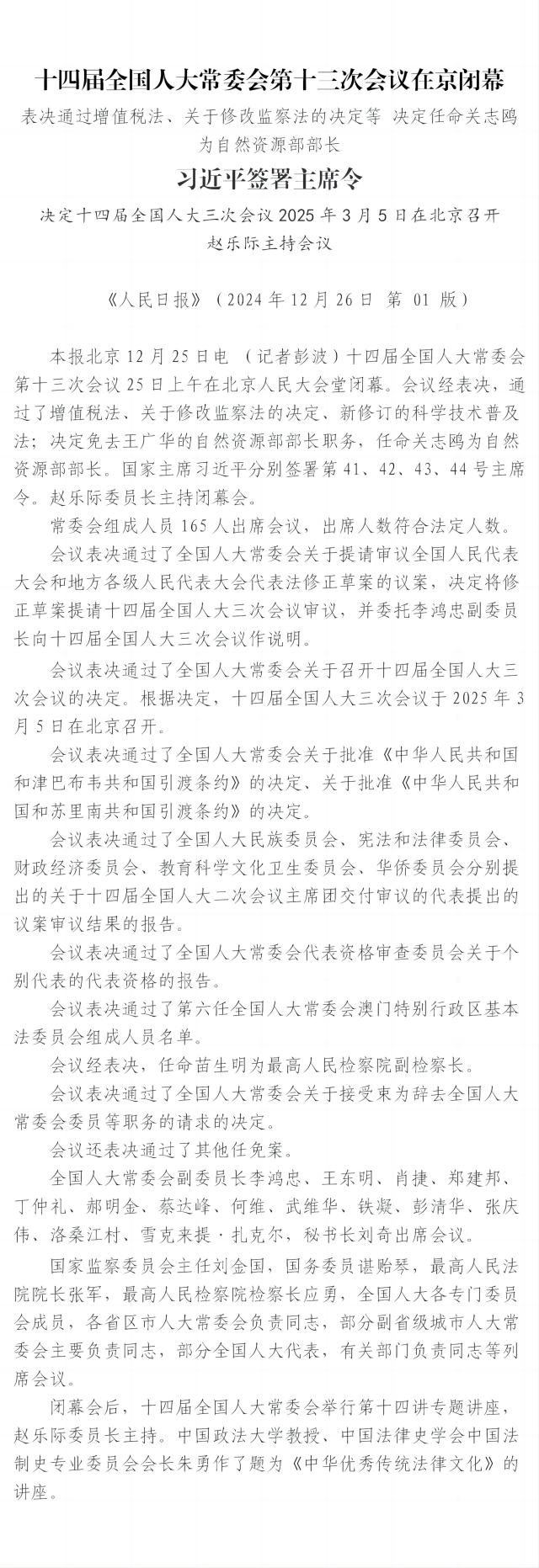 十四屆全國人大常委會(huì)第十三次會(huì)議在京閉幕