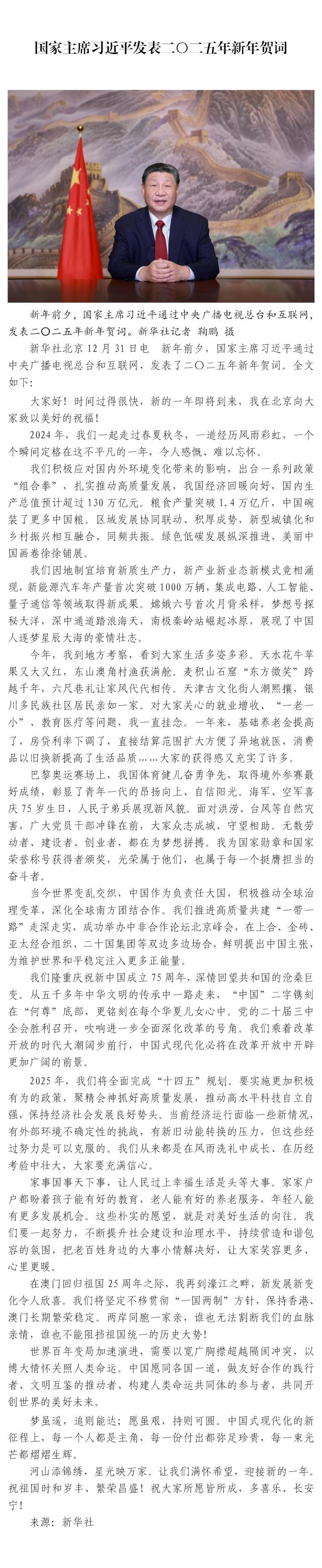 國家主席習(xí)近平發(fā)表二〇二五年新年賀詞