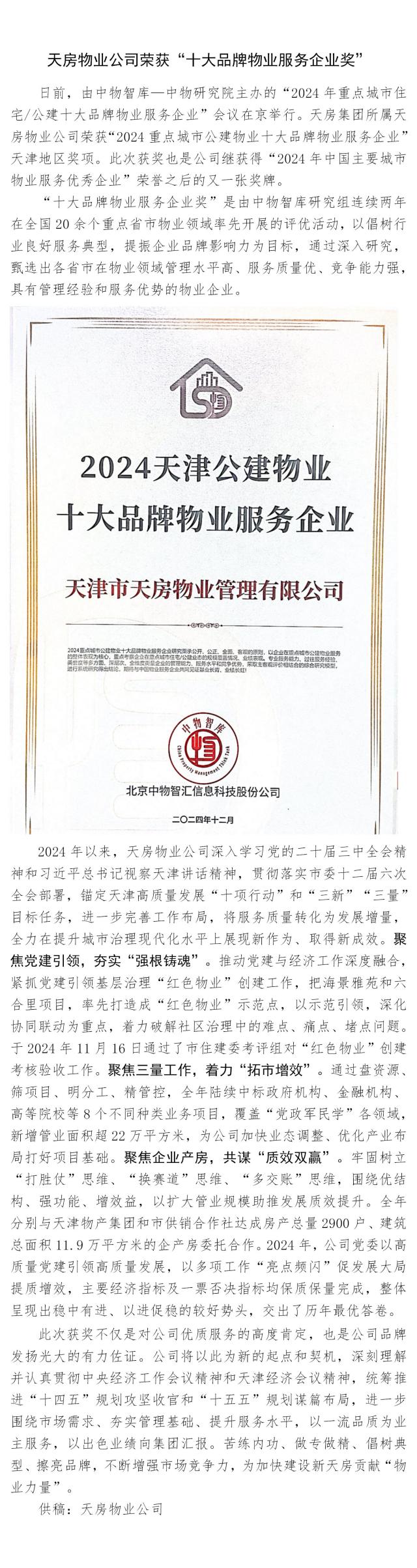天房物業(yè)公司榮獲“十大品牌物業(yè)服務(wù)企業(yè)獎(jiǎng)”
