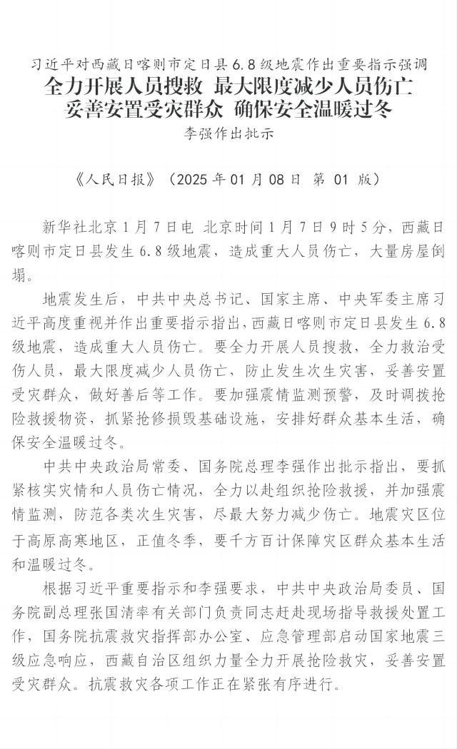 習近平對西藏日喀則市定日縣6.8級地震作出重要指示強調