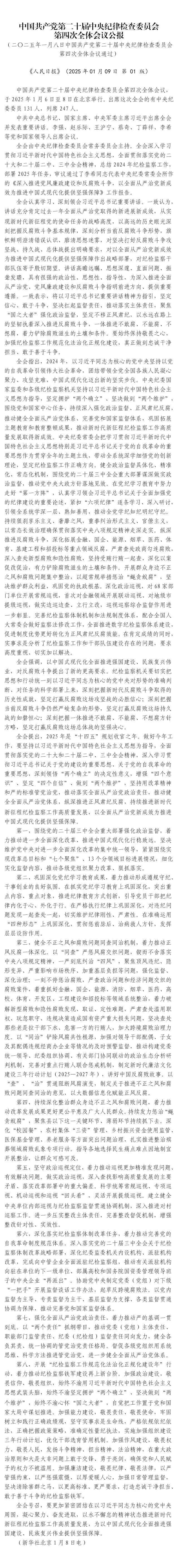中國共產(chǎn)黨第二十屆中央紀律檢查委員會 第四次全體會議公報