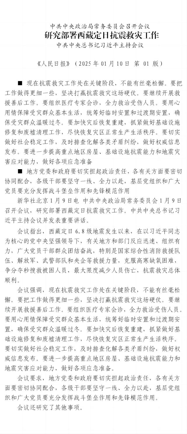 中共中央政治局常務(wù)委員會召開會議 研究部署西藏定日抗震救災(zāi)工作 中共中央總書記習近平主持會議