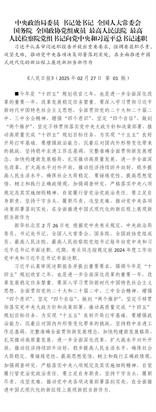 中央政治局委員 書記處書記 全國人大常委會 國務院 全國政協黨組成員 最高人民法院 最高 人民檢察院黨組書記向黨中央和習近平總書記述職 習近平認真審閱述職報告并提出重要要求,強調要履職盡責、攻堅克難,推動黨中央各項決策部署落到實處,在全面推進中國式現代化的新征程上展現新擔當新作為