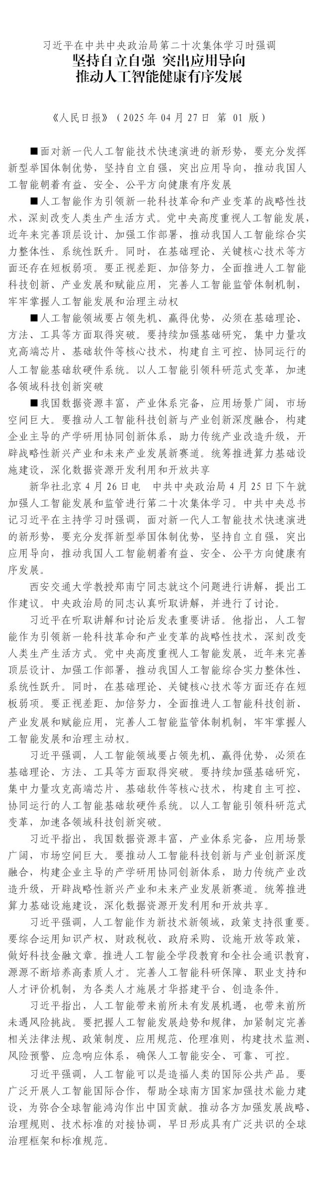 習(xí)近平在中共中央政治局第二十次集體學(xué)習(xí)時(shí)強(qiáng)調(diào) 堅(jiān)持自立自強(qiáng) 突出應(yīng)用導(dǎo)向 推動(dòng)人工智能健康有序發(fā)展