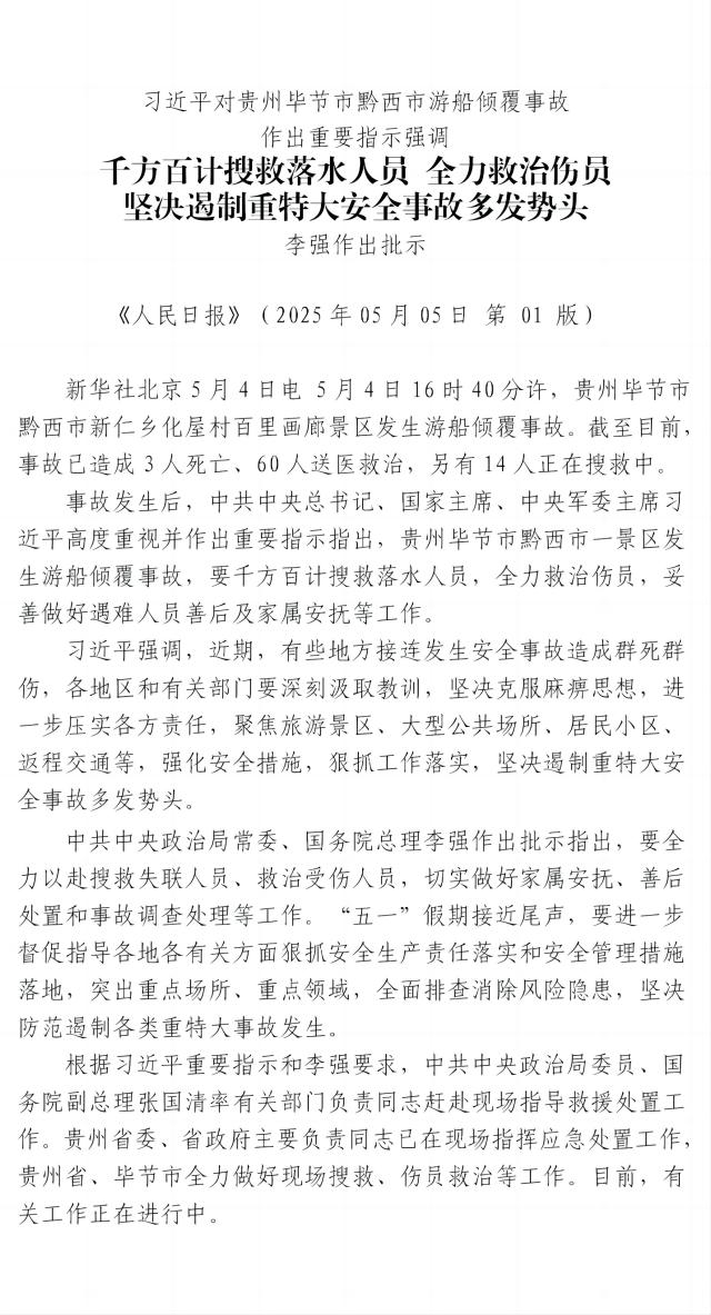 習(xí)近平對(duì)貴州畢節(jié)市黔西市游船傾覆事故作出重要指示強(qiáng)調(diào)
