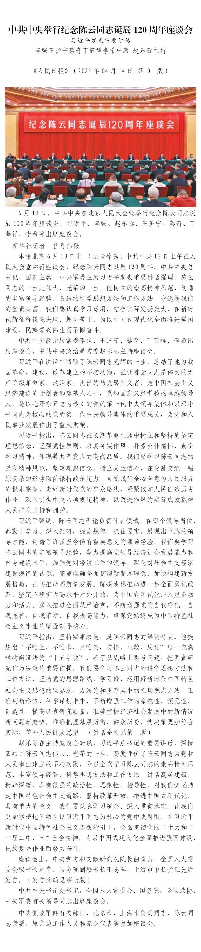 中共中央舉行紀(jì)念陳云同志誕辰120周年座談會