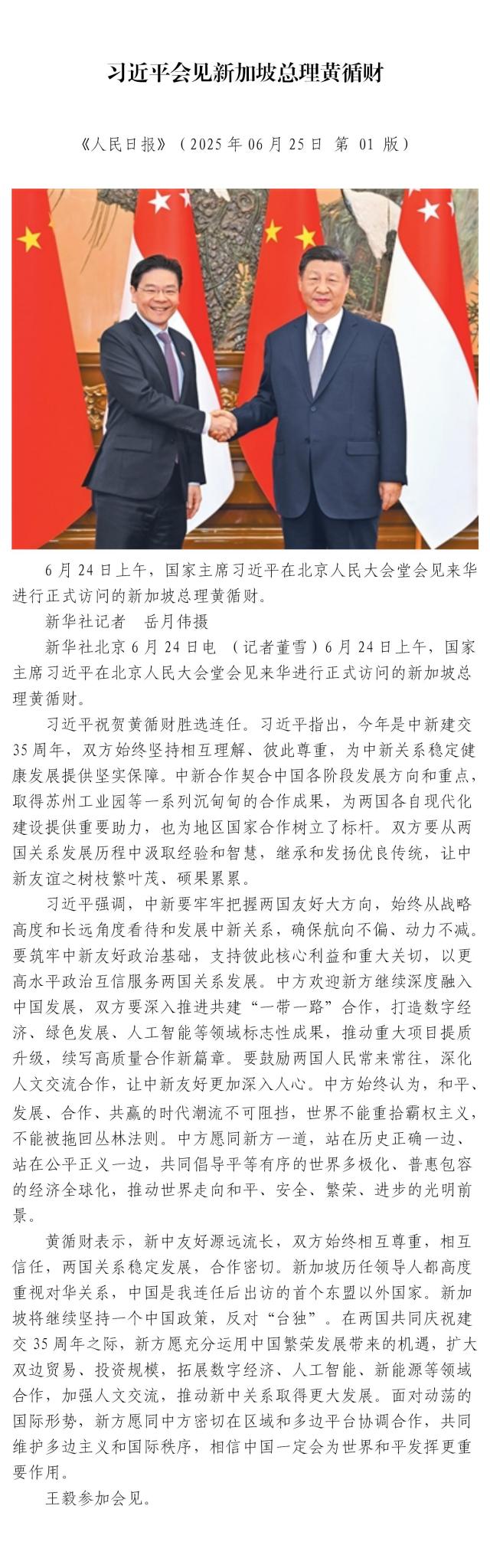 習(xí)近平會(huì)見新加坡總理黃循財(cái)