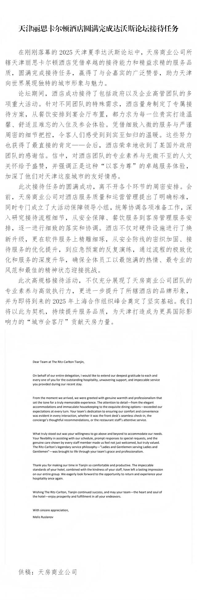 天津麗思卡爾頓酒店圓滿完成達(dá)沃斯論壇接待任務(wù)