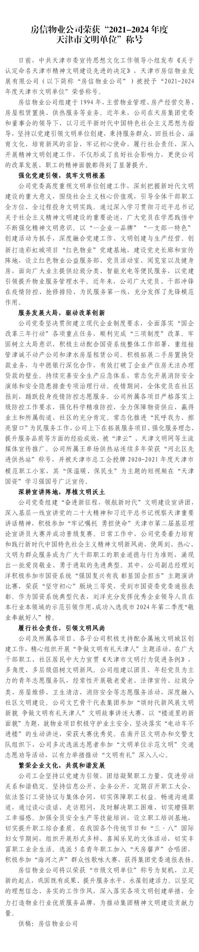 房信物業(yè)公司榮獲“2021-2024年度天津市文明單位”稱號(hào)