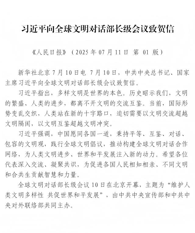 習(xí)近平向全球文明對(duì)話部長(zhǎng)級(jí)會(huì)議致賀信