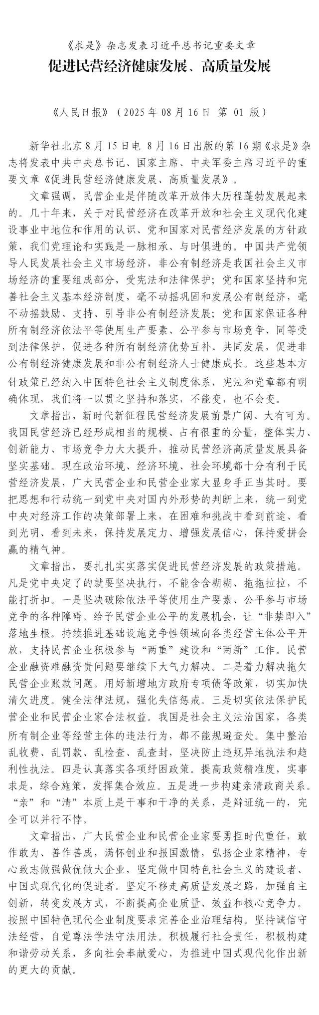 《求是》雜志發(fā)表習(xí)近平總書(shū)記重要文章 促進(jìn)民營(yíng)經(jīng)濟(jì)健康發(fā)展、高質(zhì)量發(fā)展