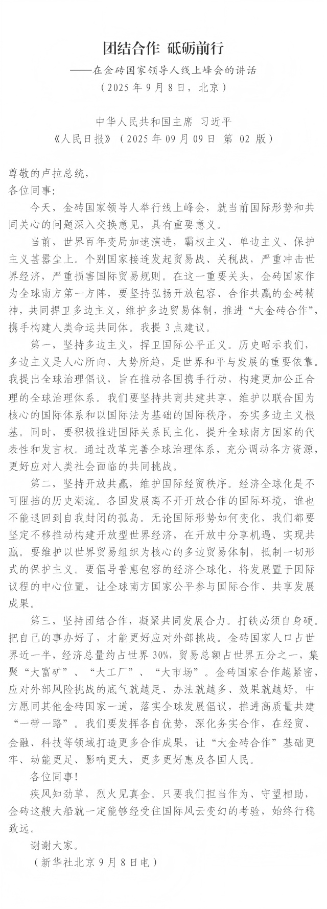 團(tuán)結(jié)合作 砥礪前行 ——在金磚國(guó)家領(lǐng)導(dǎo)人線上峰會(huì)的講話