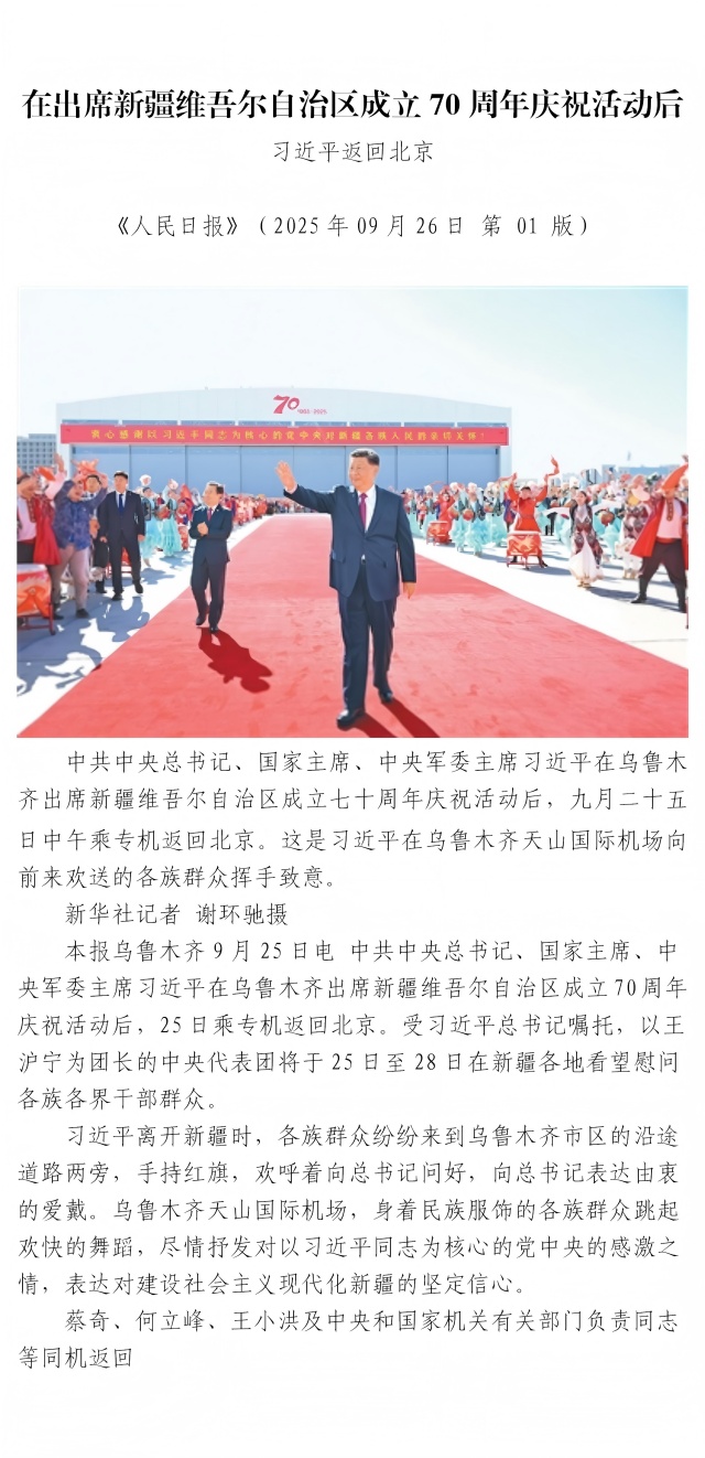 在出席新疆維吾爾自治區(qū)成立70周年慶祝活動(dòng)后