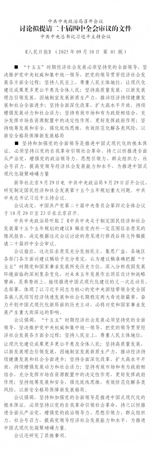 中共中央政治局召開會議 討論擬提請二十屆四中全會審議的文件 中共中央總書記習(xí)近平主持會議