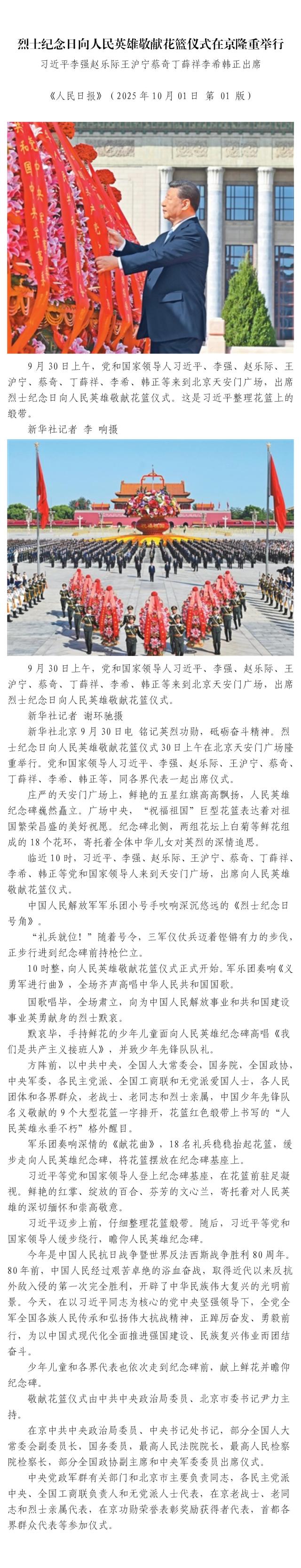 烈士紀(jì)念日向人民英雄敬獻(xiàn)花籃儀式在京隆重舉行