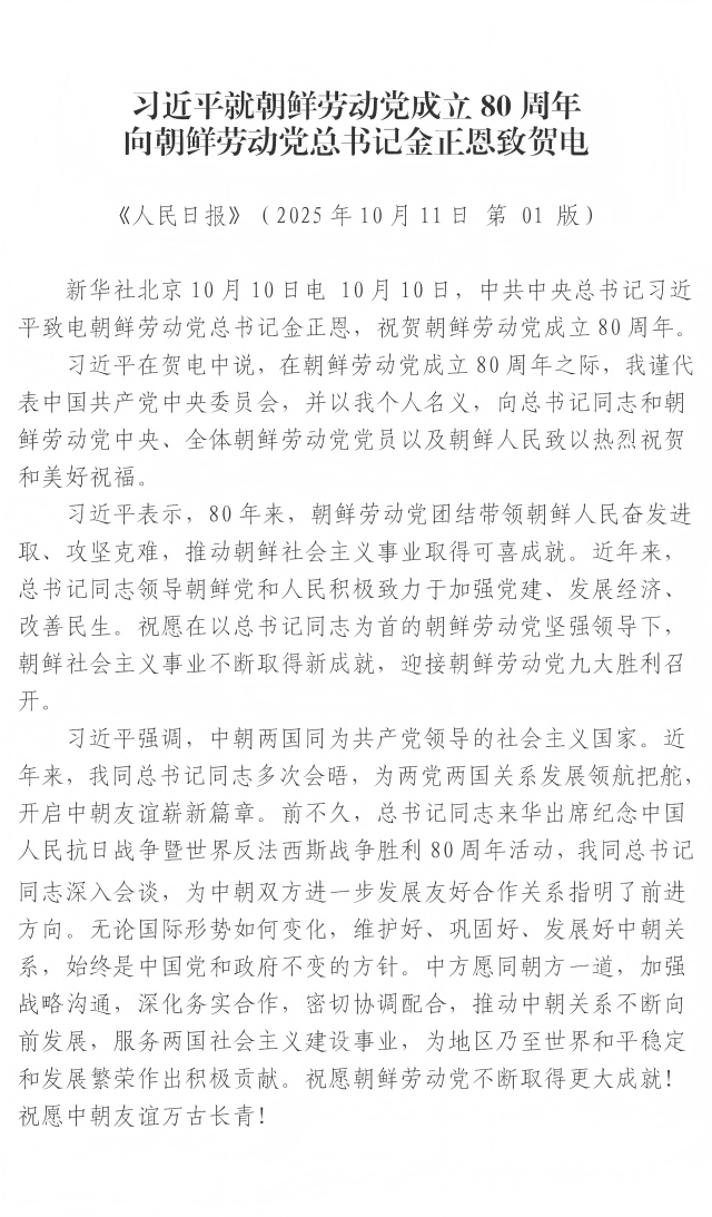 習(xí)近平就朝鮮勞動黨成立80周年向朝鮮勞動黨總書記金正恩致賀電