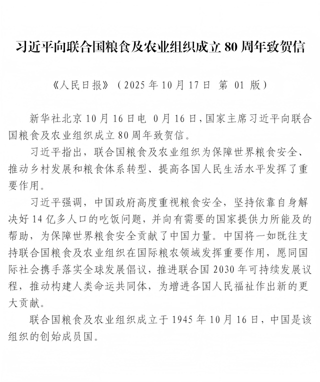 習(xí)近平向聯(lián)合國糧食及農(nóng)業(yè)組織成立80周年致賀信