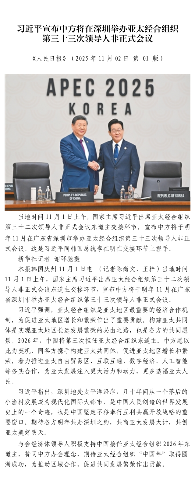 習(xí)近平宣布中方將在深圳舉辦亞太經(jīng)合組織第三十三次領(lǐng)導(dǎo)人非正式會(huì)議