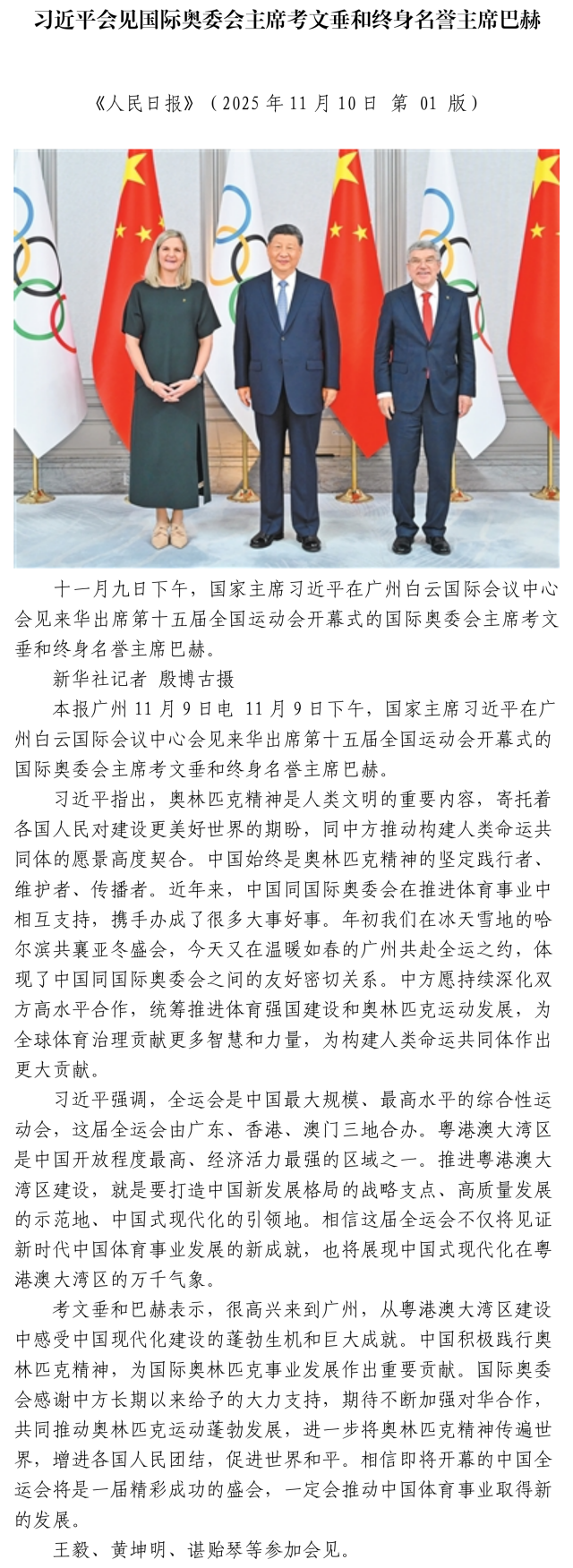 習(xí)近平會見國際奧委會主席考文垂和終身名譽主席巴赫