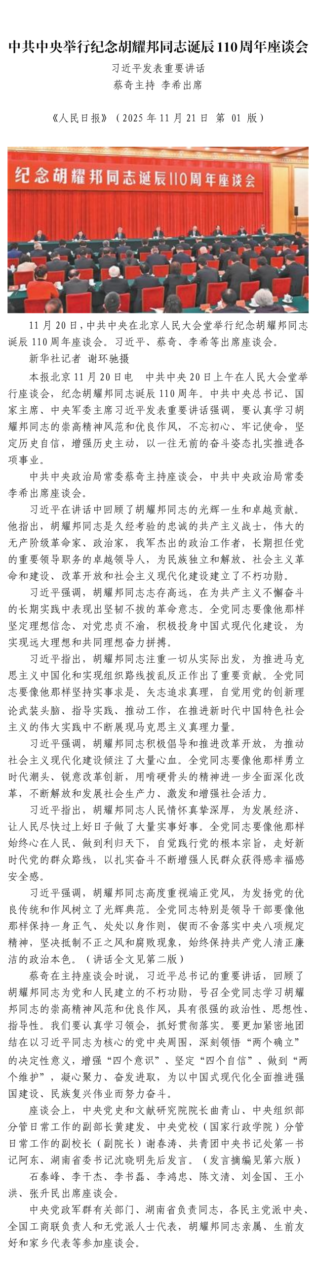中共中央舉行紀念胡耀邦同志誕辰110周年座談會