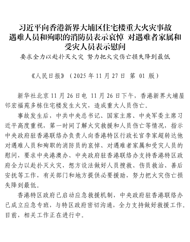習(xí)近平向香港新界大埔區(qū)住宅樓重大火災(zāi)事故遇難人員和殉職的消防員表示哀悼 對遇難者家屬和受災(zāi)人員表示慰問