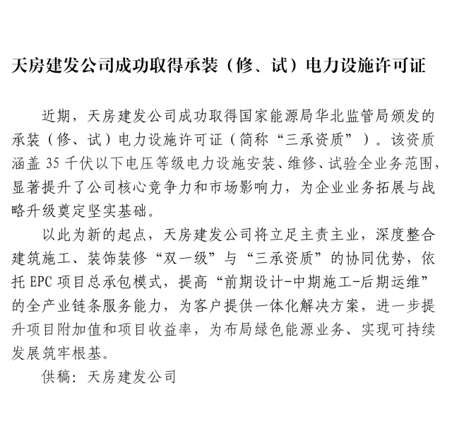 天房建發(fā)公司成功取得承裝(修、試)電力設(shè)施許可證