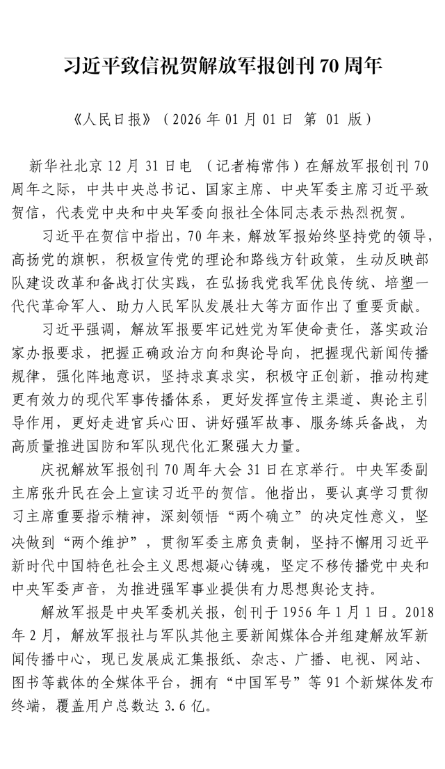 習(xí)近平致信祝賀解放軍報創(chuàng)刊70周年