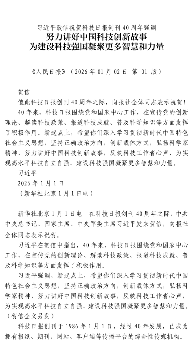 習(xí)近平致信祝賀科技日報創(chuàng)刊40周年強調(diào)