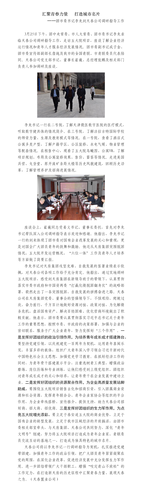 匯聚青春力量 ??打造城市名片——團(tuán)市委書(shū)記李龍到天泰公司調(diào)研指導(dǎo)工作