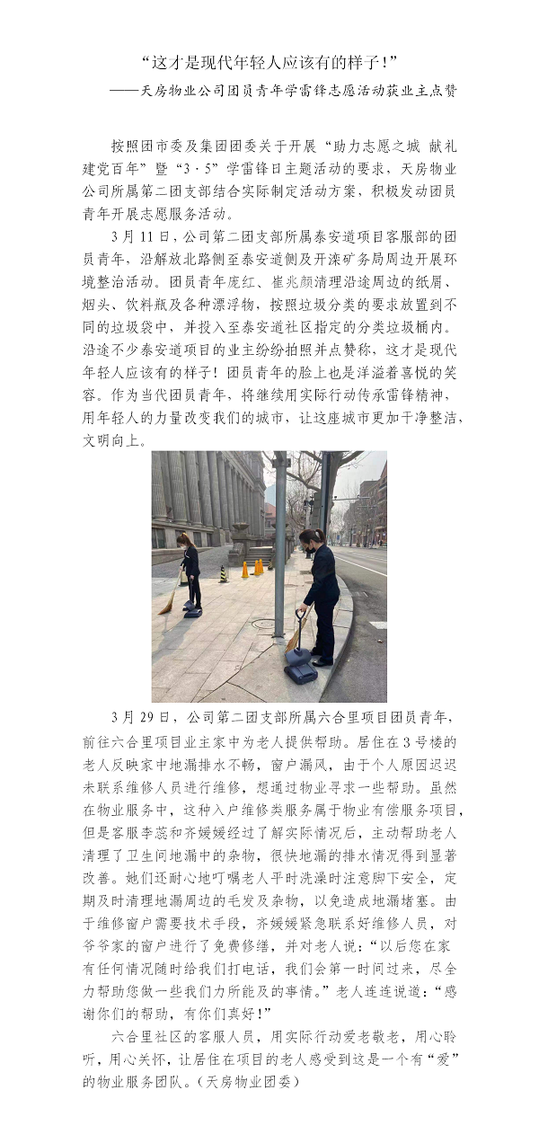 “這才是現(xiàn)代年輕人應(yīng)該有的樣子!”——天房物業(yè)公司團(tuán)員青年學(xué)雷鋒志愿活動(dòng)獲業(yè)主點(diǎn)贊