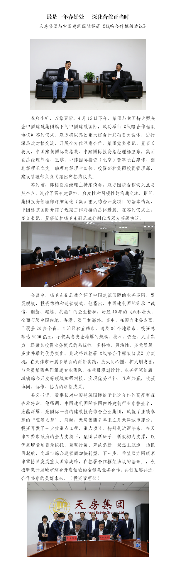最是一年春好處 ??深化合作正當時——天房集團與中國建筑國際簽署《戰(zhàn)略合作框架協(xié)議》