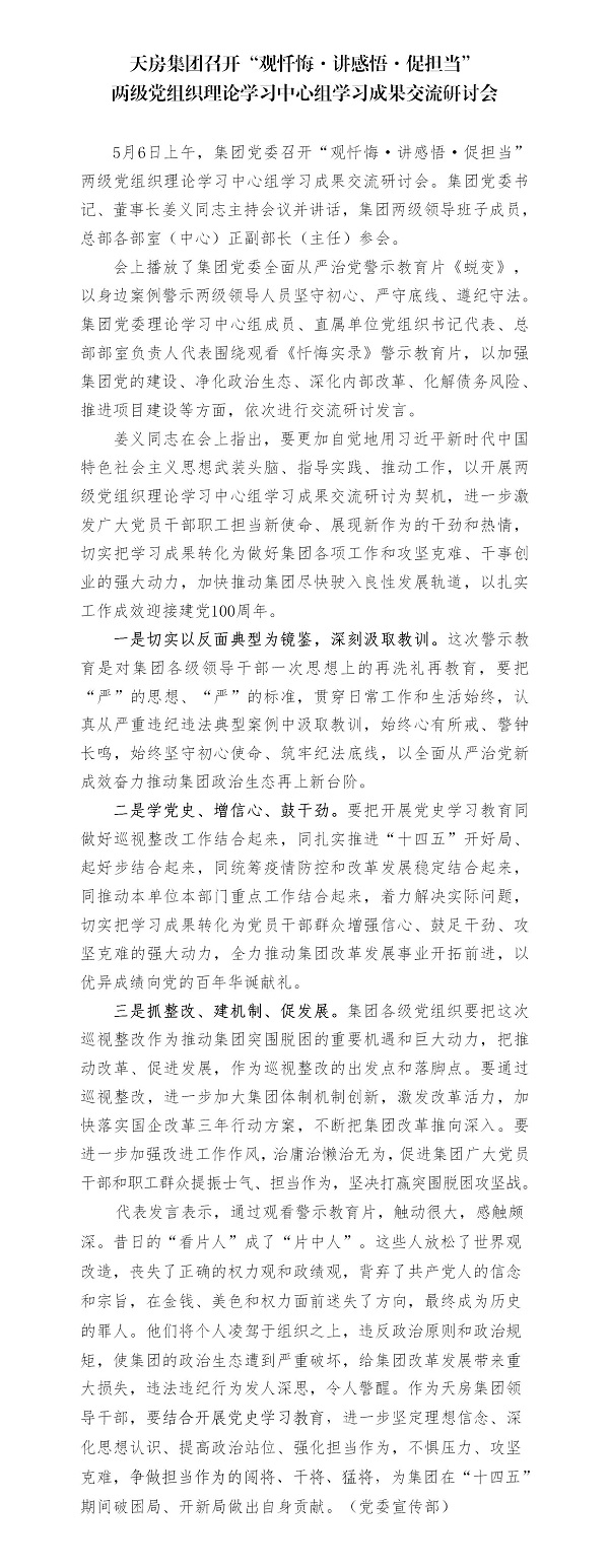 天房集團召開“觀懺悔·講感悟·促擔當”兩級黨組織理論學習中心組學習成果交流研討會