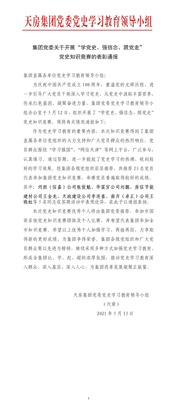 集團(tuán)黨委關(guān)于開展“學(xué)黨史、強(qiáng)信念、跟黨走”黨史知識競賽的表彰通報