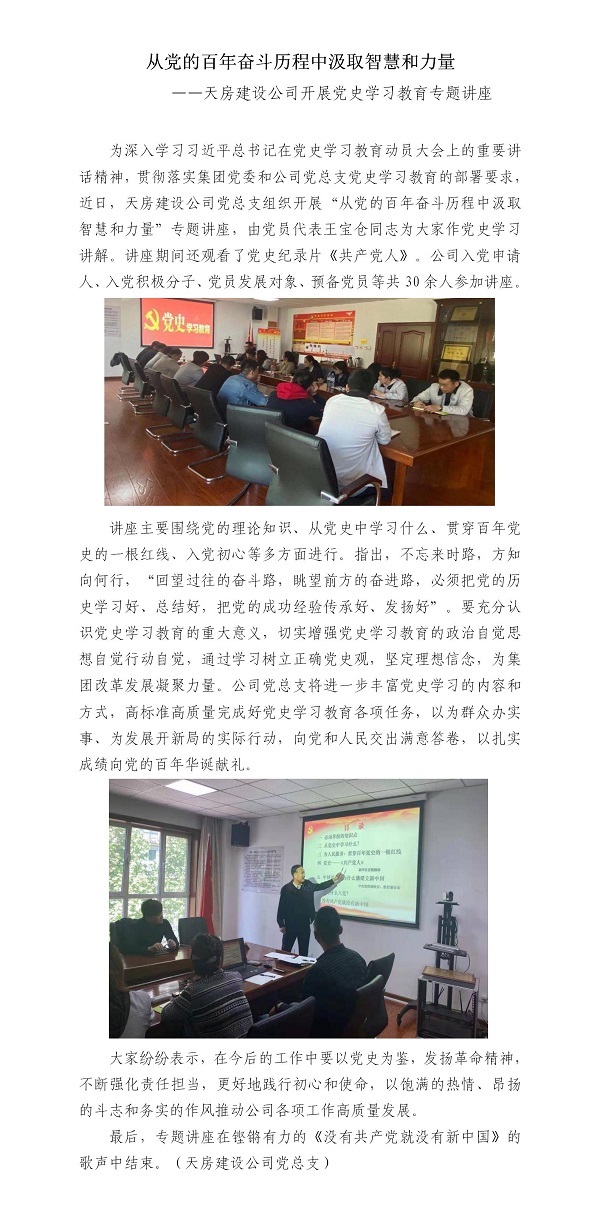 從黨的百年奮斗歷程中汲取智慧和力量?——天房建設(shè)公司開(kāi)展黨史學(xué)習(xí)教育專題講座