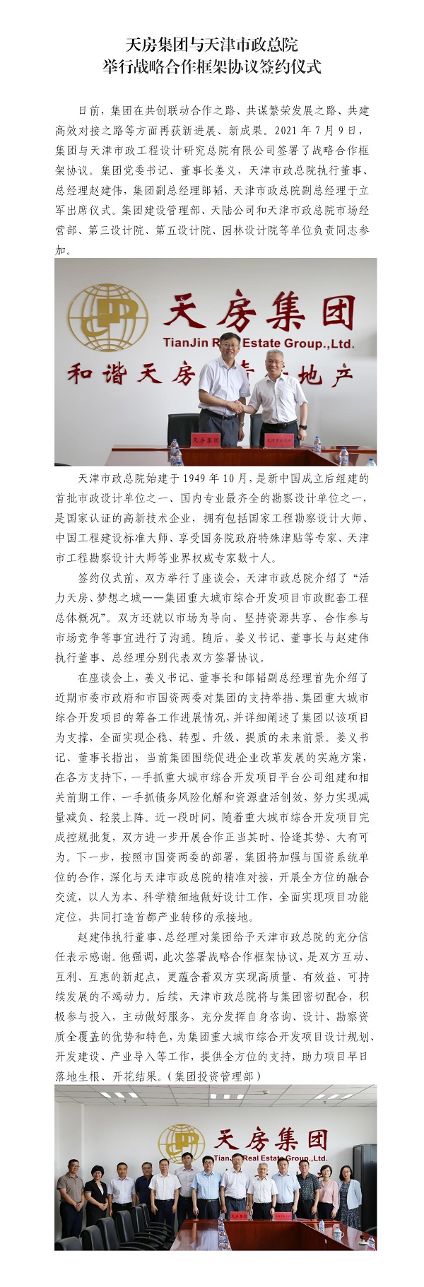 天房集團(tuán)與天津市政總院舉行戰(zhàn)略合作框架協(xié)議簽約儀式