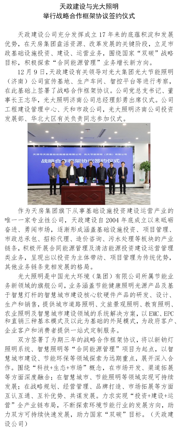 天政建設(shè)與光大照明舉行戰(zhàn)略合作框架協(xié)議簽約儀式