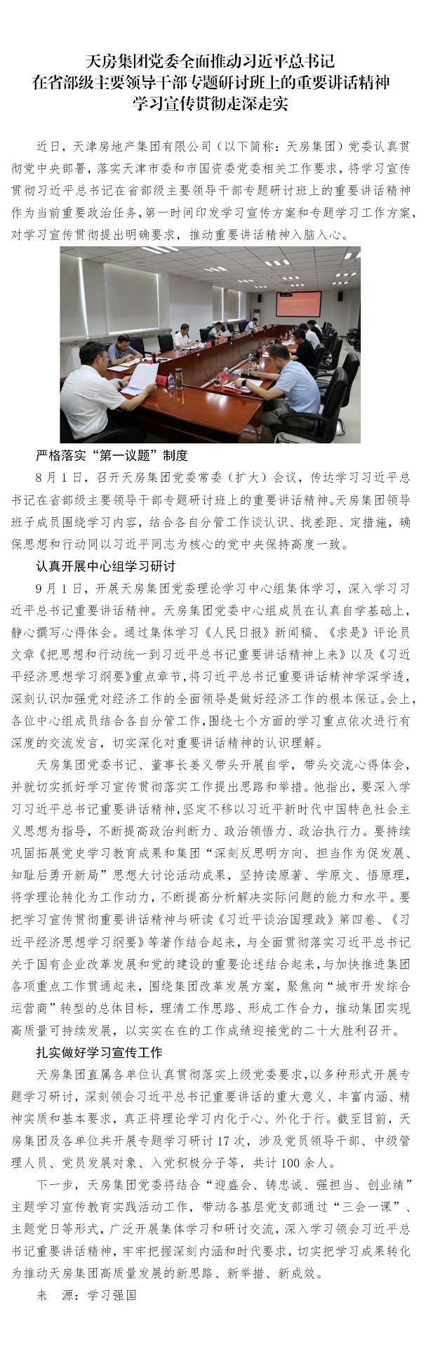 天房集團黨委全面推動習(xí)近平總書記在省部級主要領(lǐng)導(dǎo)干部專題研討班上的重要講話精神學(xué)習(xí)宣傳貫徹走深走實