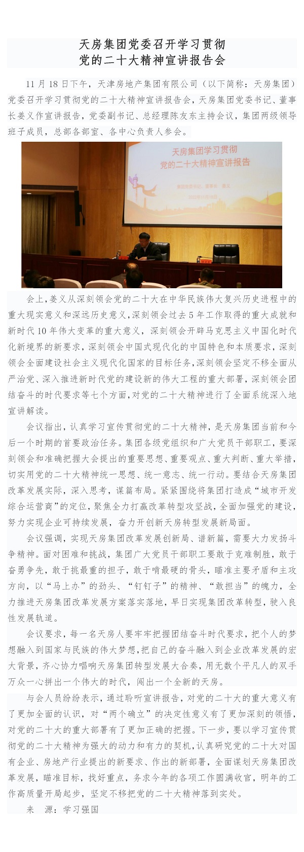 天房集團黨委召開學習貫徹黨的二十大精神宣講報告會