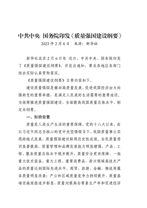 中共中央 國務(wù)院印發(fā)《質(zhì)量強(qiáng)國建設(shè)綱要》