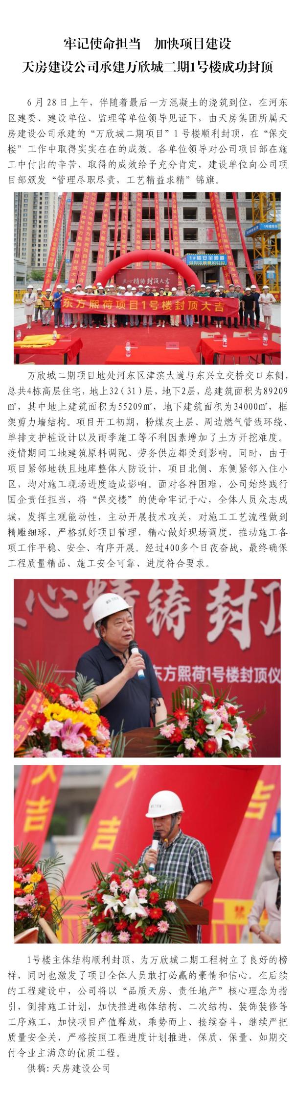 牢記使命擔(dān)當(dāng) 加快項(xiàng)目建設(shè) 天房建設(shè)公司承建萬(wàn)欣城二期1號(hào)樓成功封頂
