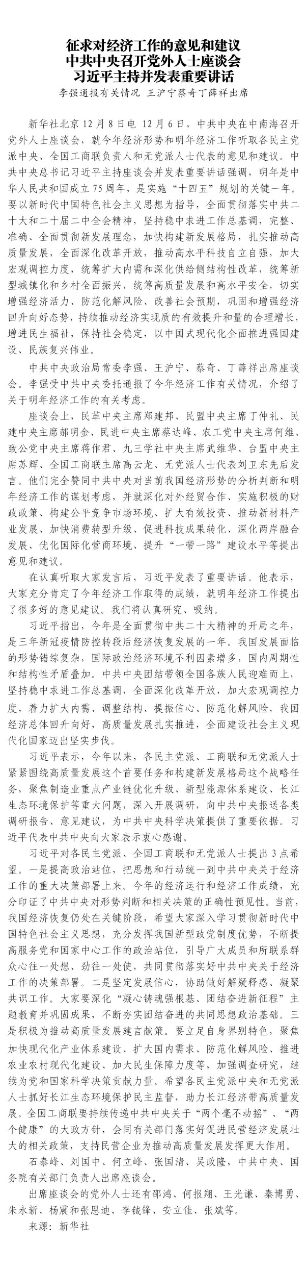 征求對(duì)經(jīng)濟(jì)工作的意見和建議 中共中央召開黨外人士座談會(huì) 習(xí)近平主持并發(fā)表重要講話