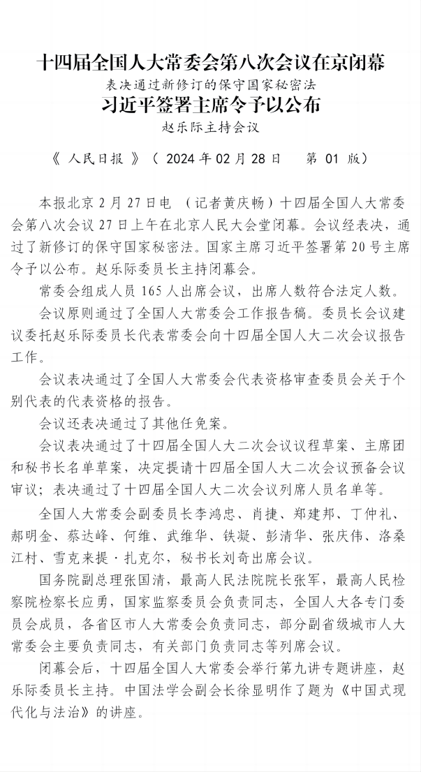 十四屆全國(guó)人大常委會(huì)第八次會(huì)議在京閉幕