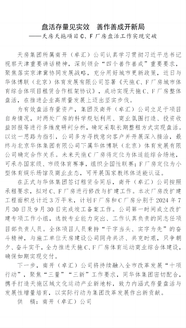 盤活存量見實效 善作善成開新局 ——天房天拖項目C、F廠房盤活工作實現突破