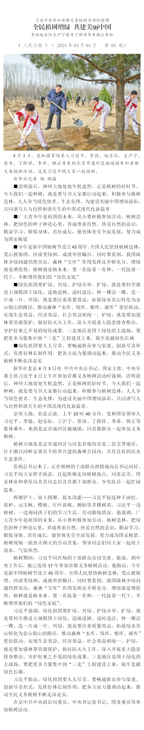 習近平在參加首都義務植樹活動時強調 全民植樹增綠 共建美麗中國 李強趙樂際王滬寧蔡奇丁薛祥李希韓正參加