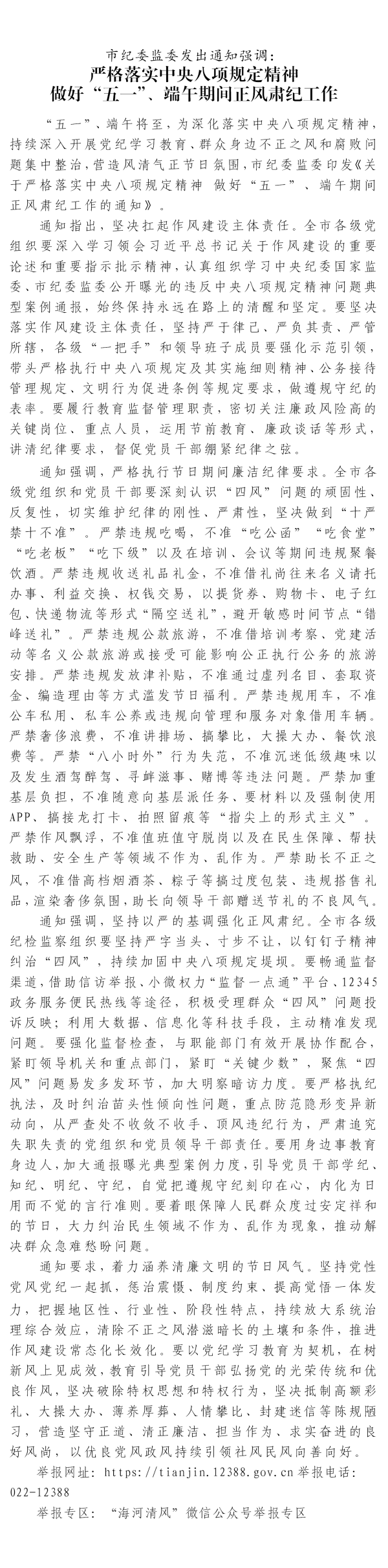 市紀(jì)委監(jiān)委發(fā)出通知強(qiáng)調(diào): 嚴(yán)格落實(shí)中央八項(xiàng)規(guī)定精神 做好“五一”、端午期間正風(fēng)肅紀(jì)工作