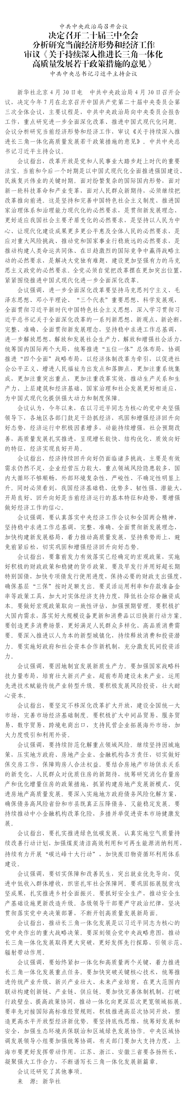 中共中央政治局召開會議 決定召開二十屆三中全會 分析研究當(dāng)前經(jīng)濟(jì)形勢和經(jīng)濟(jì)工作 審議《關(guān)于持續(xù)深入推進(jìn)長三角一體化 高質(zhì)量發(fā)展若干政策措施的意見》 中共中央總書記習(xí)近平主持會議
