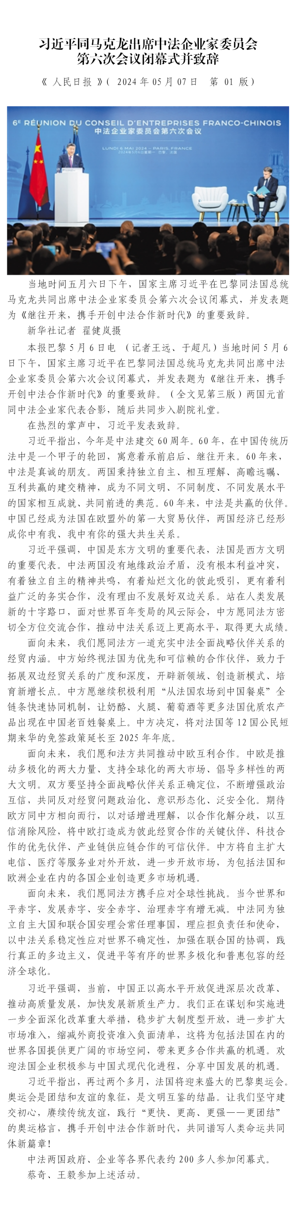習(xí)近平同馬克龍出席中法企業(yè)家委員會(huì) 第六次會(huì)議閉幕式并致辭
