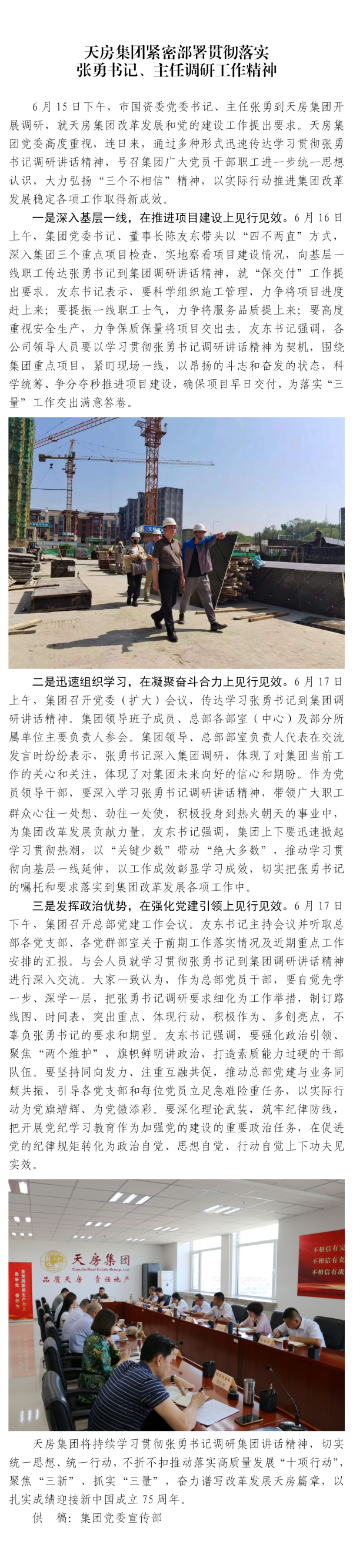 天房集團(tuán)緊密部署貫徹落實 張勇書記、主任調(diào)研工作精神