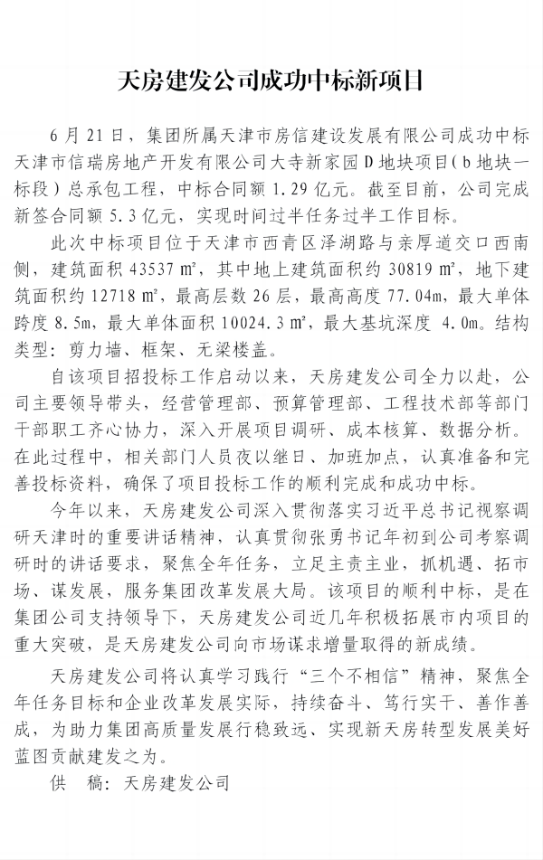 天房建發(fā)公司成功中標(biāo)新項(xiàng)目